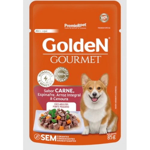 GoldeN Gourmet Cães Adultos de Porte Pequeno Sabor Carne, Espinafre, Arroz Integral e Cenoura é um alimento Premium Especial que faz parte da linha GoldeN Gourmet. Este produto é um alimento úmido completo indicado para cães adultos saudável e de porte pequeno.