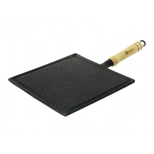 A Bifeteira Estriada Quadrada possui um cabo de madeira, sua dimensão equivale a 22 x 22 cm,sua chapa é de formato quadrado e estriada, sendo ideal para o preparo de carnes, pães, ovos, legumes, peixes. Muito utilizada também por bares e restaurantes para servir porções de carnes pois mantém aquecido por mais tempo o alimento.