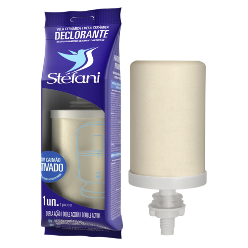 Dupla Ação - É uma Vela Cerâmica Declorante que contém em sue interior carvão ativado (GAC - Granular Activated Carbon), um produto de origem vegetal obtido a partir da casca do coco e utilizado mundialmente em sistemas de purificação de água, pois reduz odores, sabores e o teor de cloro presente na água.