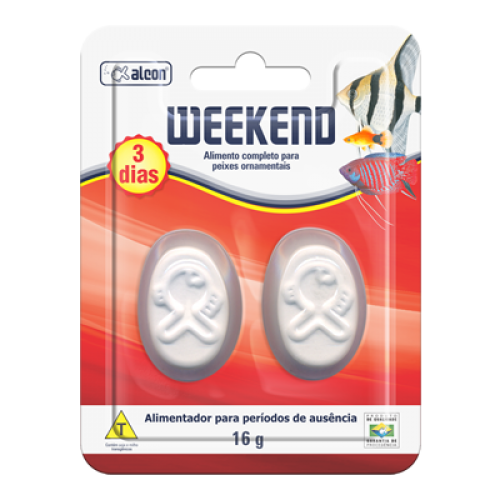 Alcon Weekend é um alimentador indicado para períodos de ausência, quando não é possível alimentar os peixes diariamente com os alimentos tradicionais. Um bloco de sulfato de cálcio serve de suporte para grânulos de alimento, que são liberados aos peixes à medida que o bloco vai se dissolvendo na água do aquário.