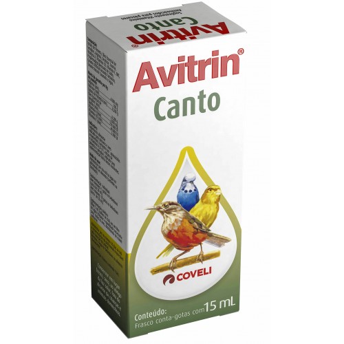 Avitrin Canto é composto por nutrientes que favorecem a abertura do Canto. Sua fórmula é composta por ingredientes que atuam diretamente sobre os pássaros canóros, estimulando o canto. Contém em sua composição Extrato de Pimenta, Óleo Essencial de Gengibre, Arginina, Dextrose, Taurina, Vitamina A, Vitamina D3, Vitamina E, BHT, Propilenoglicol, Benzoato de Sódio, Corante Artificial Amarelo Tartrazina, Corante Natural Caramelo e Água.